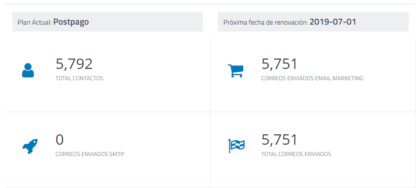 La sección de Inicio de Email muestra el plan actual que tiene contratado, el total de contactos, número de correos enviados a través de Marketing y a través de SMTP.